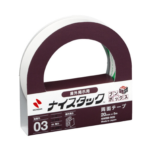 ニチバンのナイスタックシリーズ。風雨に強く凹凸面でも使えるベニア・ブロック塀などの屋外用の両面テープ。基材が布なため手でもまっすぐ切れ、作業性も高いです。