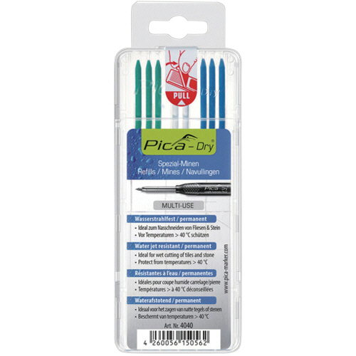 ●Pica Dry用の耐水性替芯、2B緑・青・白の3色入です。