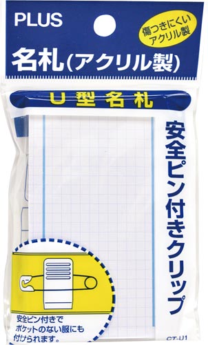 ハードタイプのU型名札。安全ピンと樹脂クリップ付。