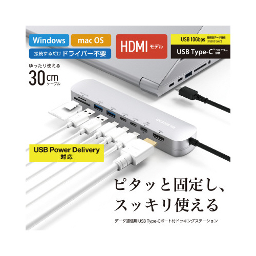 USB10Gbps(USB3.2(Gen2))に対応したUSBType-Cポートを搭載したドッキングステーション。全てのポートを本体1面に搭載し、両面テープでデスクに固定できるスタンド付き。