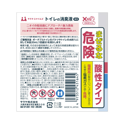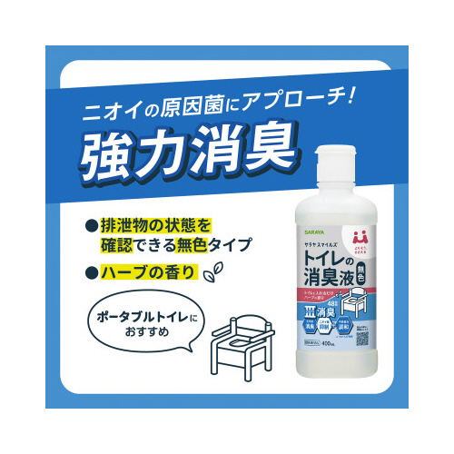 ニオイの原因菌にアプローチ!トリプル消臭効果。化学的に消臭・原因菌も抑制。排泄物の状態を確認できる無色タイプ。ポータルブルトイレ使用時だけでなく、仮設トイレ・キャンピングカーのトイレにも。