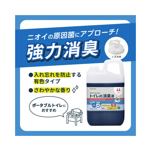 ニオイの原因菌にアプローチ!W消臭効果。化学的に消臭・原因菌も抑制。青色の液体で入れ忘れを防止。ポータルブルトイレ使用時だけでなく、仮設トイレ・キャンピングカーのトイレにも。