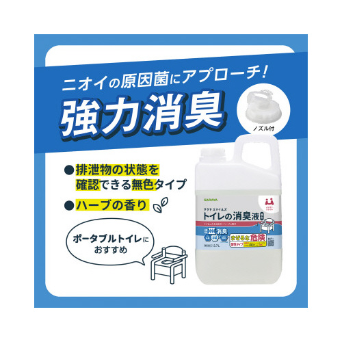ニオイの原因菌にアプローチ!トリプル消臭効果。化学的に消臭・原因菌も抑制。排泄物の状態を確認できる無色タイプ。ポータルブルトイレ使用時だけでなく、仮設トイレ・キャンピングカーのトイレにも。
