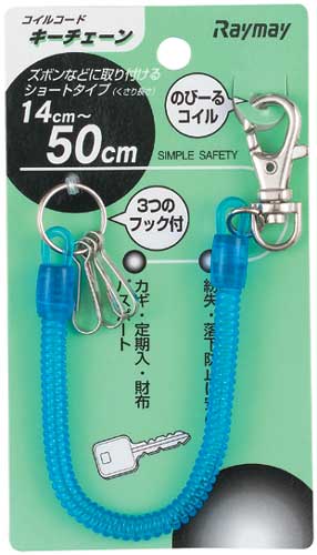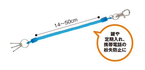 鍵の紛失、落下防止に。伸び縮みする便利なキーチェーン。最大長約50cmのショートタイプ。