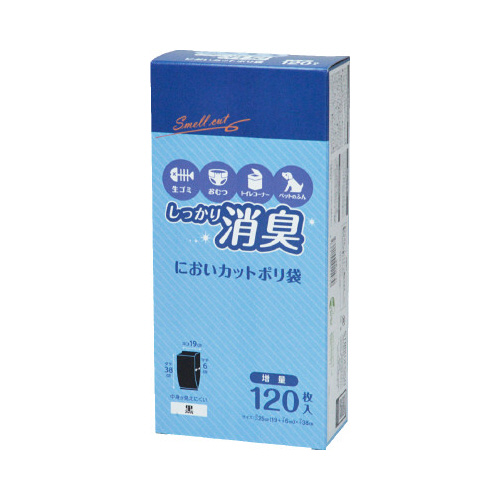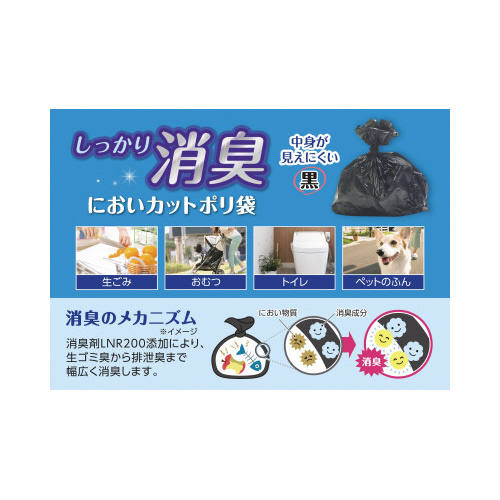 消臭剤を添加したキッチンパックサイズの消臭袋です。化学反応を利用し、生ゴミやオムツ、トイレコーナー、ペットのふんなど、気になるにおいを消臭します。本体カラーは中身が見えにくい黒色です。