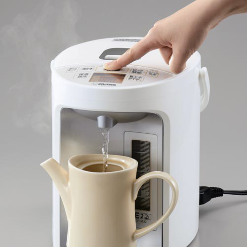 電気で沸かしてまほうびん保温のVE電気まほうびん。905Wスピード沸とうで早く沸きます。プラグをはずして給湯できるコードレス電動給湯で使いやすい!