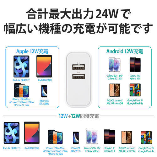 スマートフォンやタブレットに付属もしくは対応する充電用USBケーブルを使用し、各ポート最大12W(5V/2.4A)、合計最大24W(5V/4.8A)出力で充電できるAC充電器です。