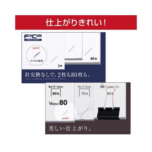 カウネット一押し!2から約80枚まで非常に軽く、疲れない!バイモシリーズの卓上80枚タイプ。とじる力を70%以上軽減しました。女性が座ったままでもとじられ、80枚まで同じ針でとじられます。