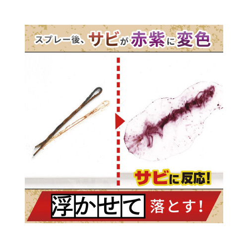 スプレーをするだけで、サビに反応、赤紫色に変化してサビがみるみる浮き出しす。浴室や洗面台に付着したヘアピンなどのもらいサビや自転車、傘縦などのサビのお掃除に最適。