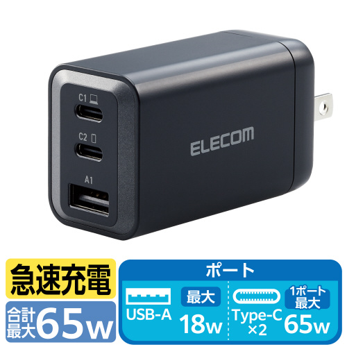 スマートフォンからノートパソコンまで幅広い機器を3台同時に充電OK!PD対応の高出力65WUSBAC充電器。充電器をこれひとつにまとめればデスク周りもすっきり。USB-Aポートを1つ搭載。