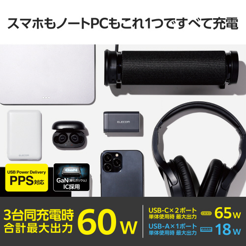 ●対応機種/各USBType-C(TM)ポートからUSBPowerDelivery(65W)及びオプション規格であるPPS(ProgrammablePowerSupply)、またはUSB-Aポートから18Wの規格内で充電が可能な機器。2ポート以上同時接続時、合計最大65Wまでの出力で充電、給電可能な機器とその組み合わせ。