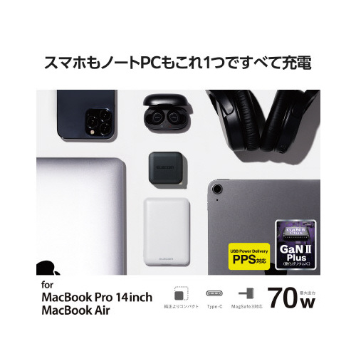 MacBookAirを高速充電可能なコンパクトモデル!最大70W出力のUSBAC充電器です。MacbookPro14インチに同梱の電源アダプターと比較し38%以上小さくなりました。