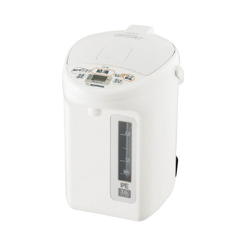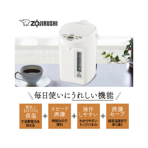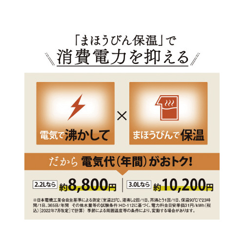 高真空2重瓶まほうびん構造で高い保温力。905Wのスピード沸とう。湯沸かし時間、消費電力量、蒸気を抑える「沸とうセーブ」(選択式)。2時間操作しないと保温ヒーターを自動オフ「省エネモード」(選択式)。