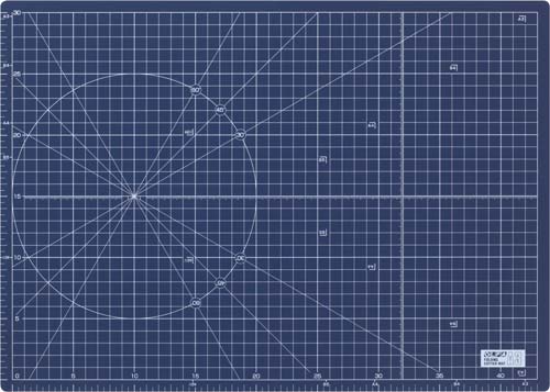 広げてA3、たたんでA4サイズのカッターマット。収納や持ち運びにも便利。左利きの方でも使いやすい表示デザイン。ネイビーカラー。