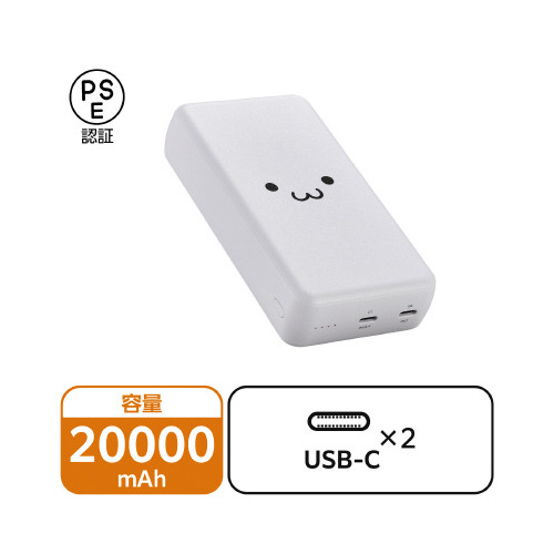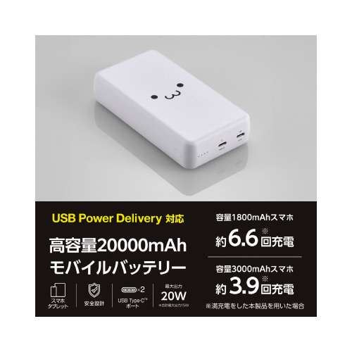 スマホを約3.9回フル充電可能な20000mAhモバッテリー。USBPowerDelivery20W対応のUSBType-Cポート2つ搭載。