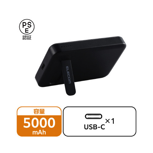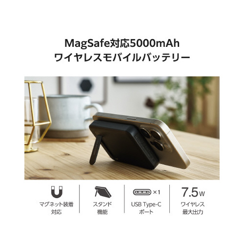 ワイヤレスで簡単充電!MagSafe対応iPhoneにマグネットで取り付け、7.5Wのワイヤレス充電が可能なモバイルバッテリー。折りたたみスタンド付き。