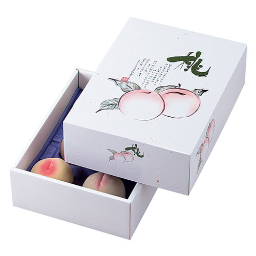サイズが355×255×110mmのフルーツ用ギフトパッケージ。桃3kg用トレーにちょうど良い大きさとなっています。桃のパッケージ、ギフト包装にいかがでしょうか。