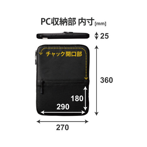 ●PC収納部内寸/幅約270mm×厚さ約25mm×高さ約360mm