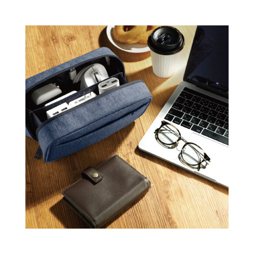 テレワークにも最適。タブレットやケーブルなどの周辺機器・ガジェット、筆記用具等ビジネス用品までまとめて収納することが可能で収納物が一覧しやすい自立型ポーチです。