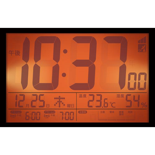 ●機能/環境目安表示(熱中症は4段階表示)、注意報と警告音のモニター付、電子音アラーム(ダブルアラーム)、電波サーチ、電波オフ、スヌーズ、アラームオートストップ、残照機能ライト