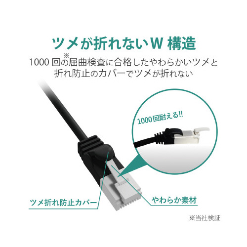 周波数帯域500MHz対応の10ギガビット・イーサネットCat6Aやわらかケーブル。ツメが折れにくいコネクター採用。※1000回屈曲検査合格