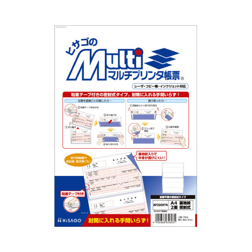 粘着テープ付の密封式タイプ。裏地紋入りのため内容が透けにくく、封筒に入れる手間が不要です。給与明細や、納品書、請求書など罫線ごと印刷してテープを剥がして折り曲げるだけ。BP2009Tの後継品です。