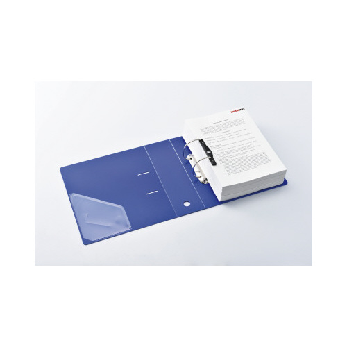 750枚大量収納のD型リングファイル。ファイルのゆがみを防ぐセーフティストッパー付き。書類をしっかり押さえる樹脂製紙押さえ付き。背見出し交換可能タイプ。