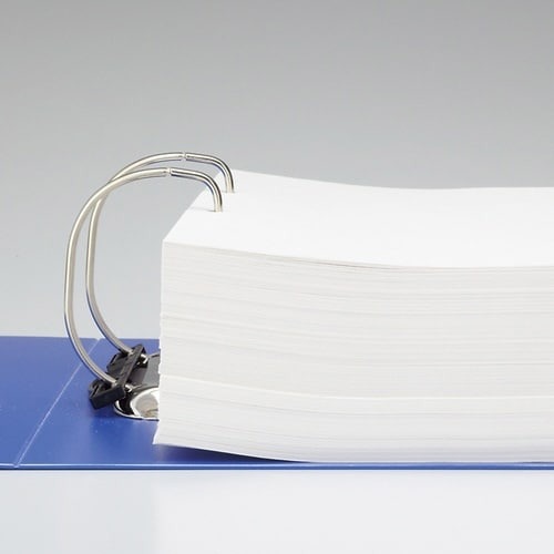 750枚大量収納のD型リングファイル。ファイルのゆがみを防ぐセーフティストッパー付き。書類をしっかり押さえる樹脂製紙押さえ付き。背見出し交換可能タイプ。