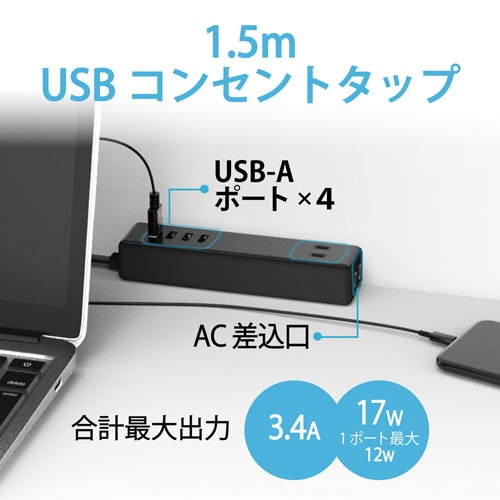 スマートフォンやタブレットをACアダプタを用意することなく充電可能。1.5mケーブル仕様でコンセントから少し離れたところへ設置したい場合に適した製品です。