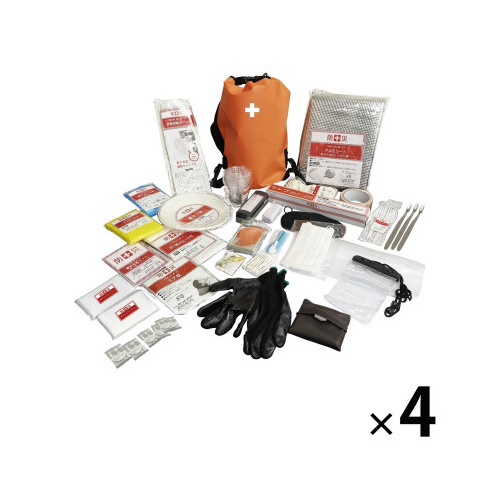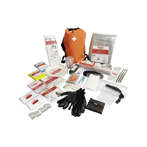 ●セット内容2/歯ブラシ3P、レインポンチョ、スマホ充電器、マスク3P、ホイッスル、プラカップ5P、スプーン&フォーク、三角巾、ラバー手袋、 ポケットティッシュ2P、カッター、アルミブランケット、筆記用具、ポリ袋3P、圧縮タオル6P、アルミシート、防水ポーチ、綿ロープ(7m)、吸水バッグ5L