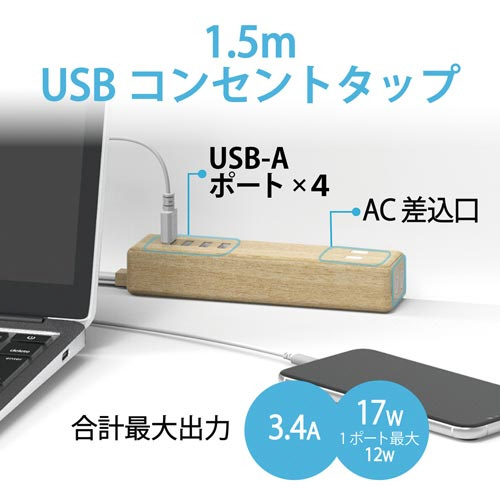 スマートフォンやタブレットをACアダプタを用意することなく充電可能。1.5mケーブル仕様でコンセントから少し離れたところへ設置したい場合に適した製品です。