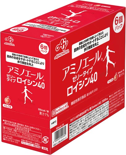 「アミノエール」ゼリータイプロイシン40は、ロイシン40%配合必須アミノ酸が配合されたゼリータイプの機能性表示食品です。軽い負荷がかかる運動との併用で、加齢によって衰える筋肉の合成をサポートすることにより歩行機能の向上に役立つことが報告されています。りんご味のすっきりとした飲み易いゼリータイプなので、体を動かした後もおいしく摂取することができます。