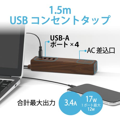 スマートフォンやタブレットをACアダプタを用意することなく充電可能。1.5mケーブル仕様でコンセントから少し離れたところへ設置したい場合に適した製品です。