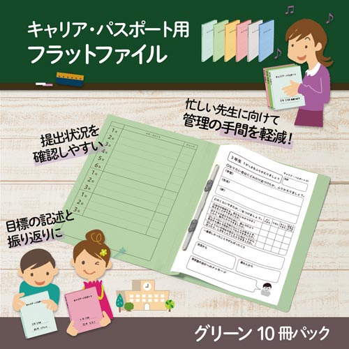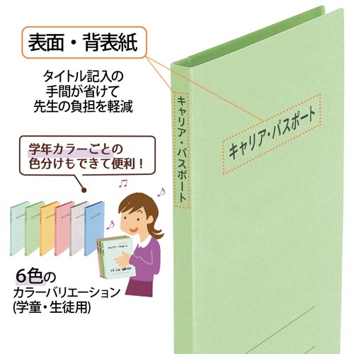 表紙・背ラベルにあらかじめタイトル・氏名記入欄を印刷したキャリアパスポート用フラットファイル。先生の管理の手間を軽減。小・中・高12学年分のチェックリスト付、クラスや楽器間引継ぎ前のチェックに。