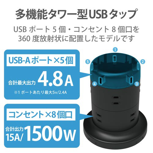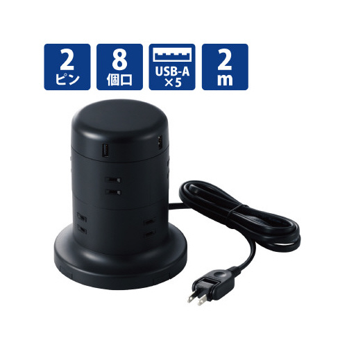 合計最大出力が4.8AのUSBポートを5つ備えたタワー型8口の電源タップです。USBポートや差込口は360度放射状に配しており、会議室の机などでの利用におすすめです。