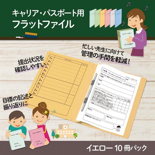 表紙・背ラベルにあらかじめタイトル・氏名記入欄を印刷したキャリアパスポート用フラットファイル。先生の管理の手間を軽減。小・中・高12学年分のチェックリスト付、クラスや楽器間引継ぎ前のチェックに。