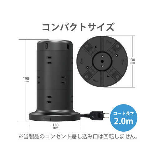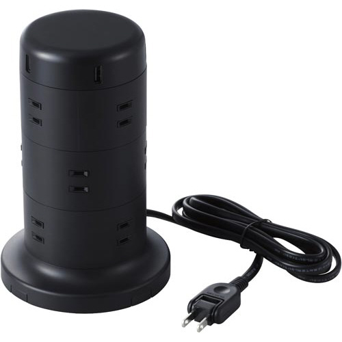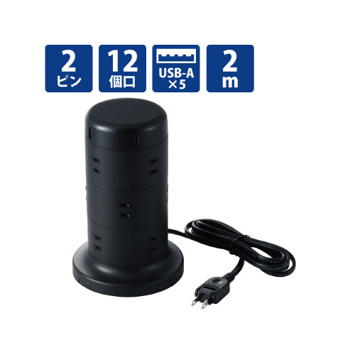 タワー型タップ/12個口/雷サージ/2m/ブラック