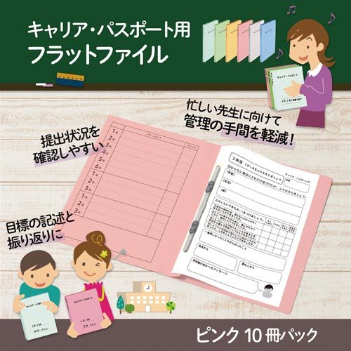 表紙・背ラベルにあらかじめタイトル・氏名記入欄を印刷したキャリアパスポート用フラットファイル。先生の管理の手間を軽減。小・中・高12学年分のチェックリスト付、クラスや楽器間引継ぎ前のチェックに。
