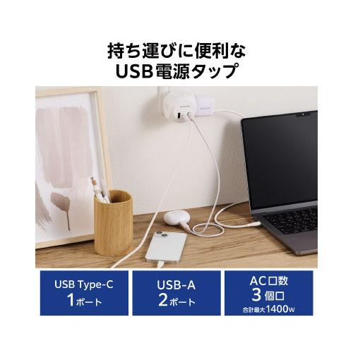 手のひらサイズの丸いUSB電源タップ。USB-A×2、USB-C×1対応。最大6台接続可能。出張や旅行に便利。安全設計。