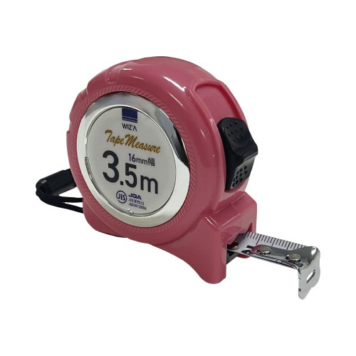 JIS付のロック付メジャーです。耐摩耗性に優れたナイロンコーティングテープを使用しています。テープ幅16mm、長さ3.5mタイプ。カラーはピンクです。