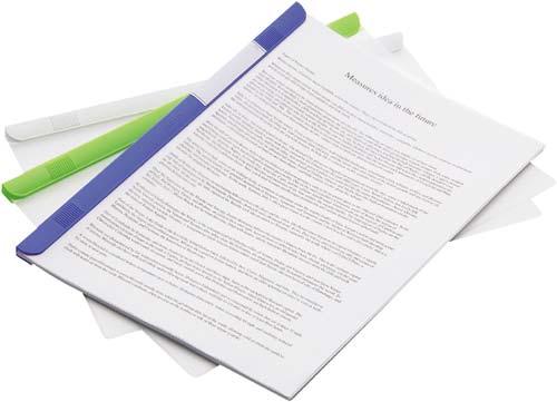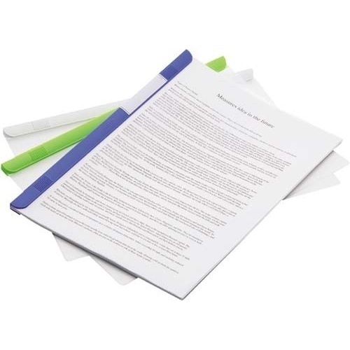 企画書などのプレゼン資料づくりに!穴をあけずにレールをシートに通すだけ!スライドバーが差し込みやすいR形状です。分類に便利なタイトルシール付きです。