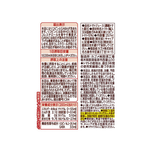 カゴメトマトジュース食塩無添加は機能性表示食品です。リコピンには血中HDL(善玉)コレステロールを増やす機能が、GABAには血圧が高めの方の血圧を下げる機能があることが報告されています。
