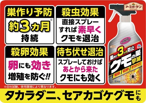 クモの巣が張られるのを約3ヵ月防止するスプレー。クモに直接かければ駆除でき、殺卵効果もあります。危険なセアカゴケグモや不快なタカラダニにも使えます。