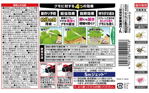 ●使用の目安/クモの巣作り予防に使用する場合、約3ヵ月持続(自社試験。使用環境により異なります。)クモの巣予防に使用する場合、噴射目安の1平方メートルあたり15‐30回使用で、1本で約30‐60平方メートルの範囲に使用できます。
