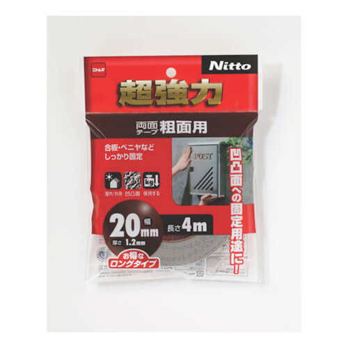●メーカー品名:ニトムズ 超強力両面テープ粗面用20×4●メーカー品番:T4593●幅(mm):20●長さ(m):4●厚さ(mm):1.2●色:グレー●粘着力:10.2N/10mm●基材:アクリルフォーム●粘着剤:アクリル系