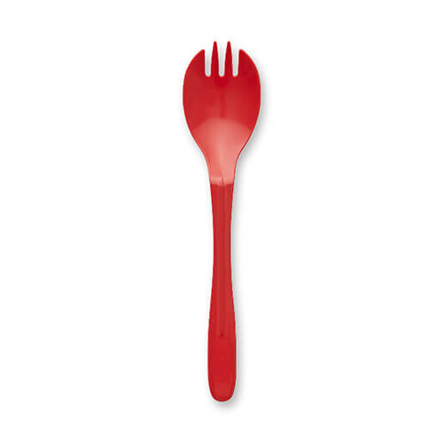プラスチック製の使い捨てフォークスプーン。カレーライス、丼物等に活用できる、しっかりとした作りです。珍しい赤色で、食卓やパーティに彩を加えてくれます。