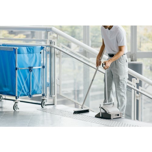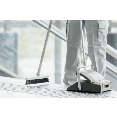 握りやすいグリップ形状。立てたまま収納ができる自立型。玄関やベランダ、庭などの掃き掃除に最適。