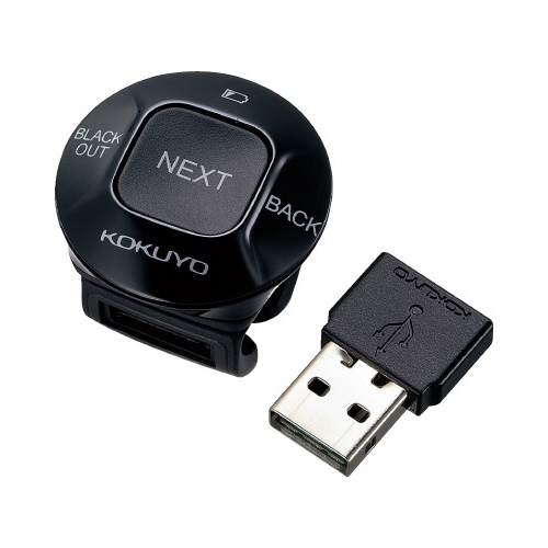 スライドのページ送りが手元でできる!指にはめるタイプなので持っていることを意識せず、プレゼンに集中できます。ドライバのインストールが不要ですぐ使える。