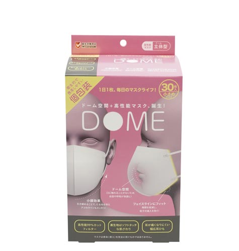 口元がマスクに接することなく呼吸や会話が楽なドーム型立体マスク。肌にフィットし隙間を低減。幅広タイプの耳ひもで耳が痛くなりにくい。VFE、BFE、PFE、99%以上(一財)カケンテストセンター測定