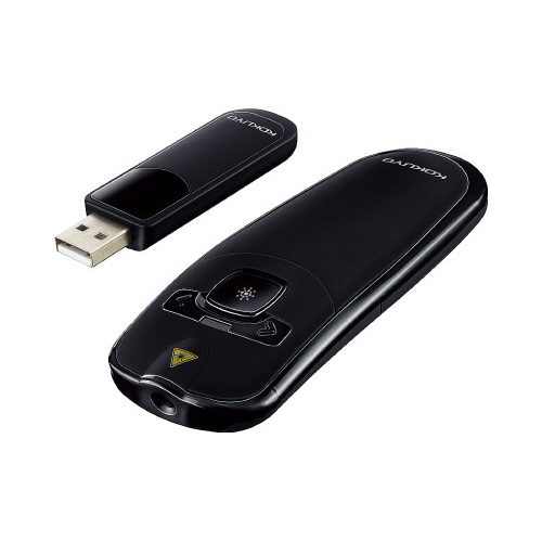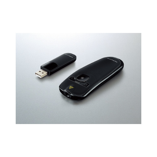 通常の赤色光に比べ、約2倍明るく見えるレーザー光を採用!手元のボタンでパワーポイントの操作が可能。通信方式はRF(ラジオ波)で全方向へ送信できます。